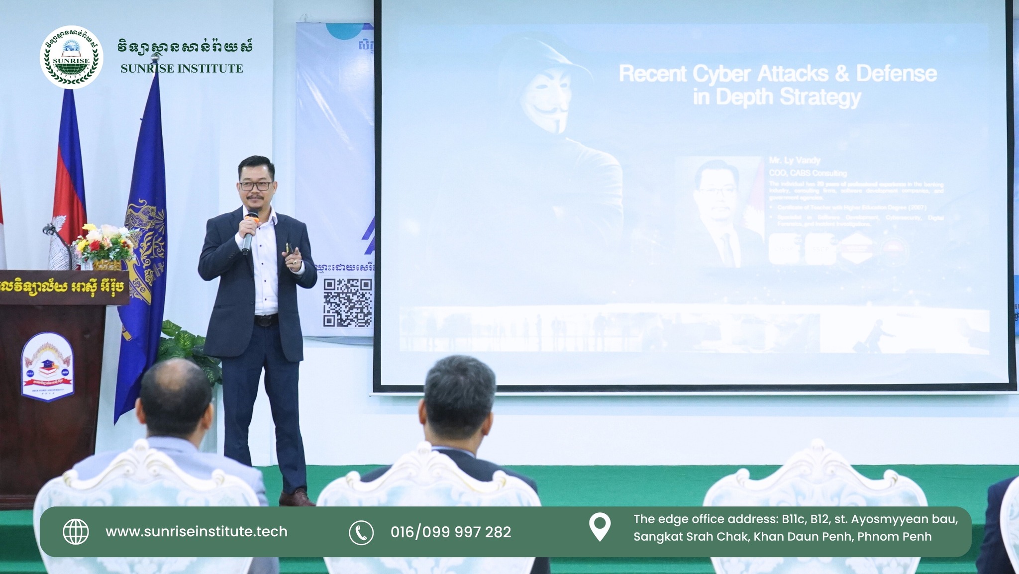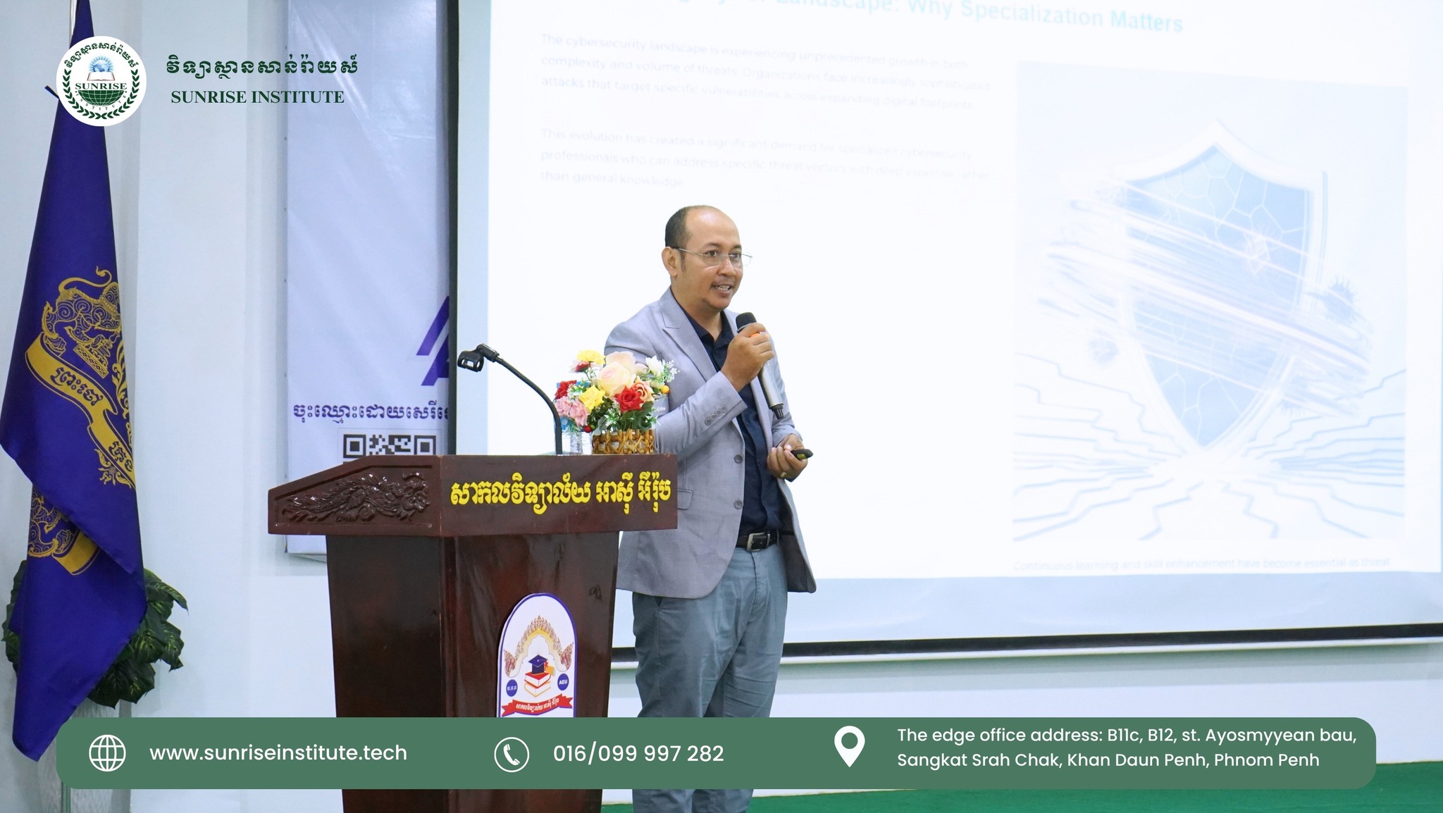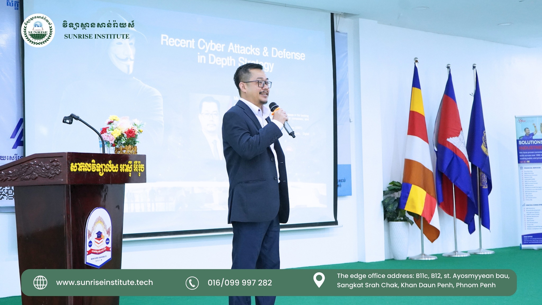លោក អេង ប៊ុនថាច់ នាយកផ្នែកប្រឹក្សាយោបល់ព័ត៌មានវិទ្យា (Director of IT Advisor) ដែលនឹងចែករំលែកពីជំនាញជាមូលដ្ឋានសម្រាប់អ្នកជំនាញ Cybersecurity។