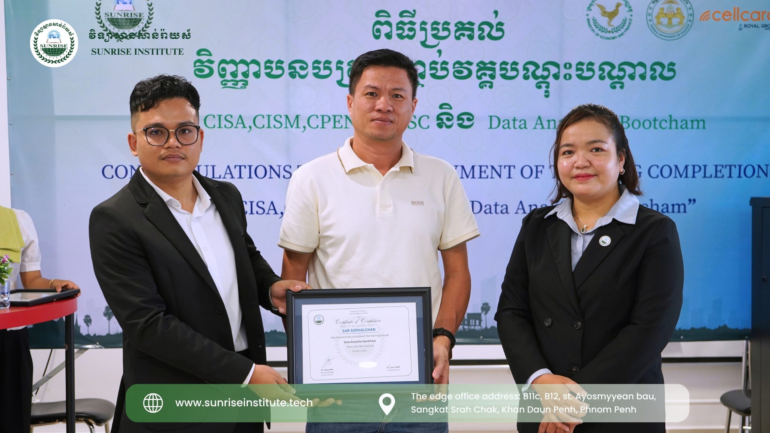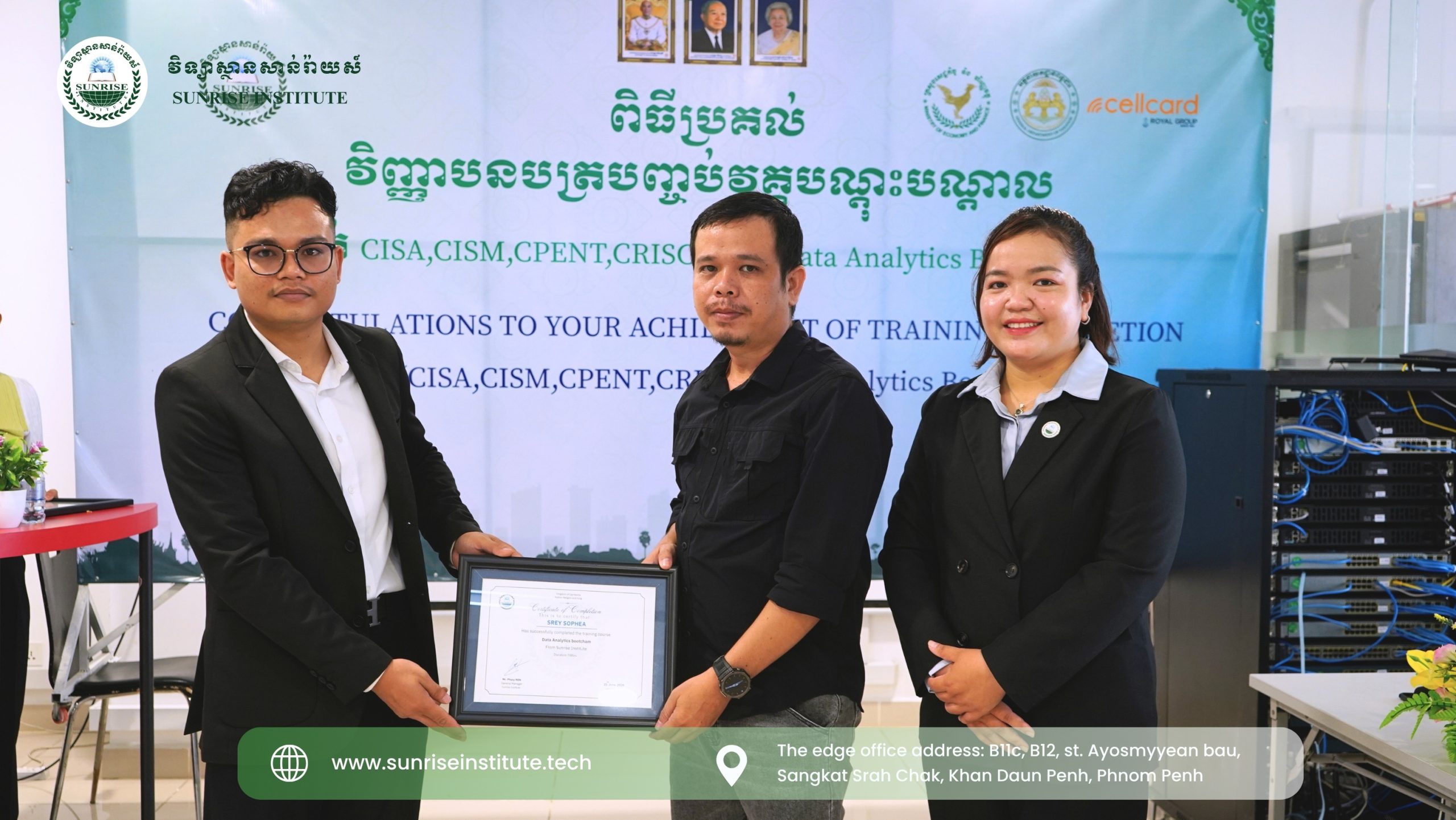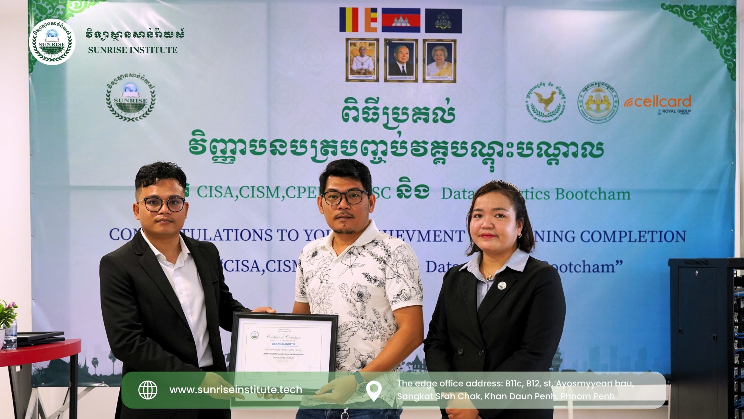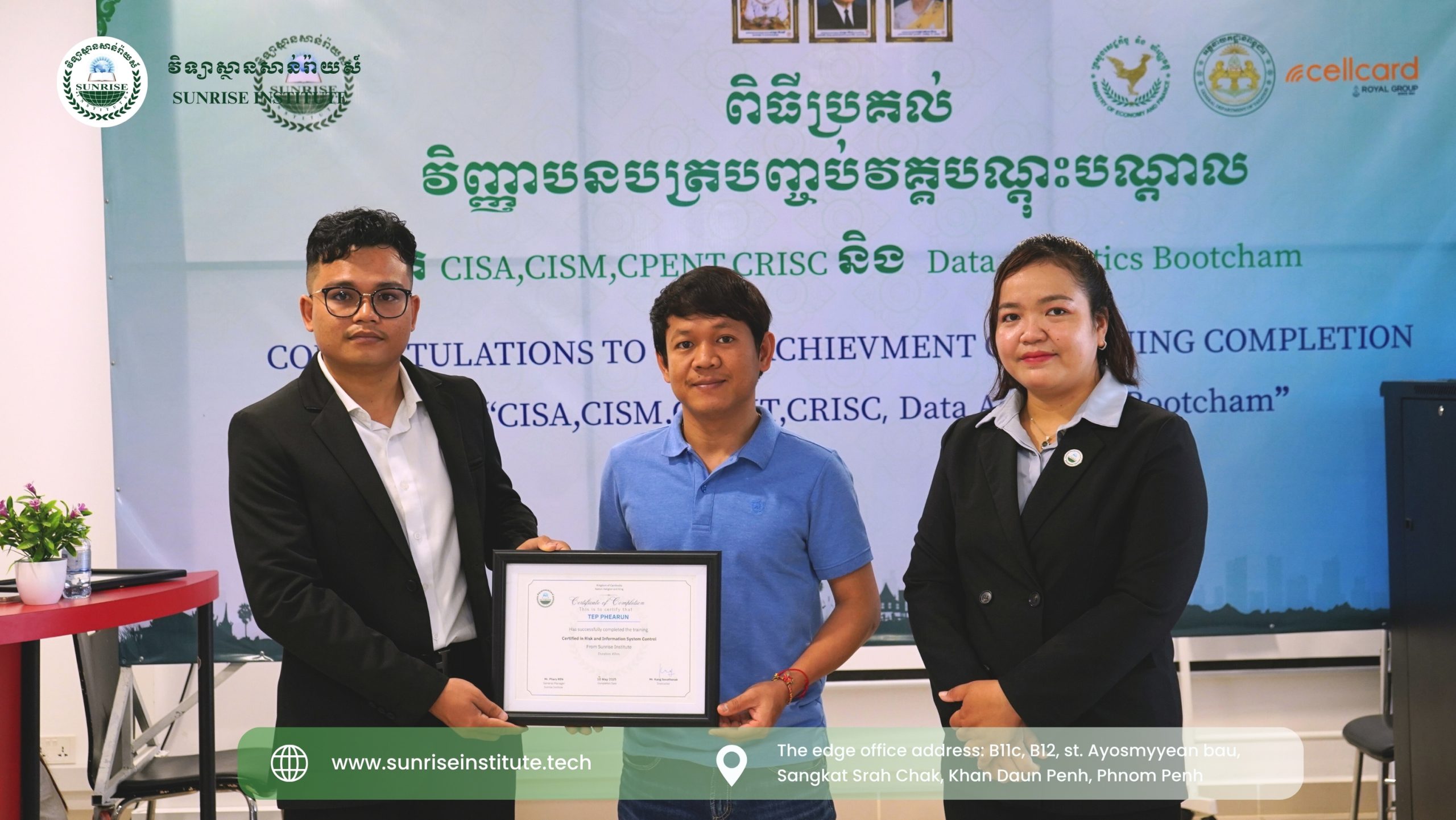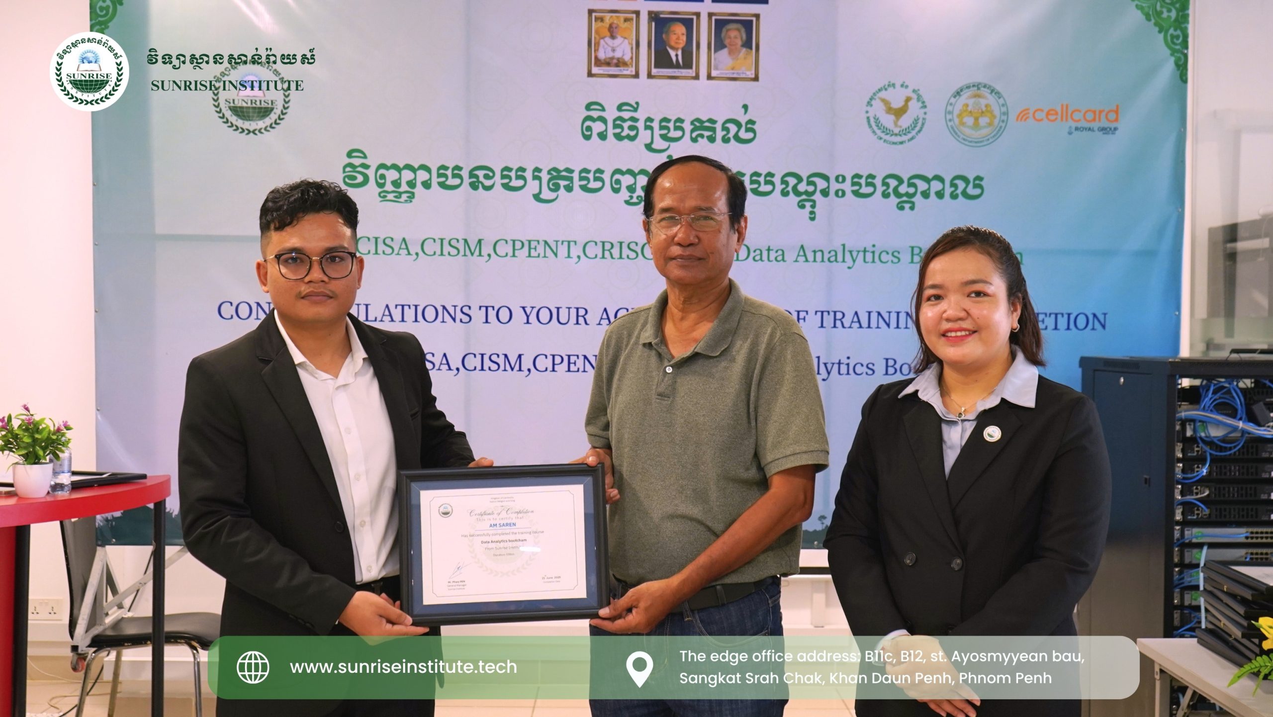 សូមអបអរសាទរដល់សក្ខាកាមដែលមកពីនាយពន្ធដារនឹង ក្រុមហ៊ុន Cellcard ដែលបណ្តុះបណ្តាលលើជំនាញ CISA ,CISM ,CPENT ,CRISC, Data Analytics បញ្ចប់ដោយជោគជ័យ ជំនាន់ទី១៥ នៃវិទ្យាស្ថានសាន់រ៉ាសយ៍។ កម្មវិធីនេះ ប្រព្រឹត្តទៅនៅថ្ងៃសៅរ៍ ៨ កើត ខែស្រាពណ៍ ឆ្នាំម្សាញ់ សប្តស័ក ពុទ្ធសករាជ ២៥៦៩ ត្រូវនឹងថ្ងៃទី២ ខែសីហា ឆ្នាំ២០២៥ ។