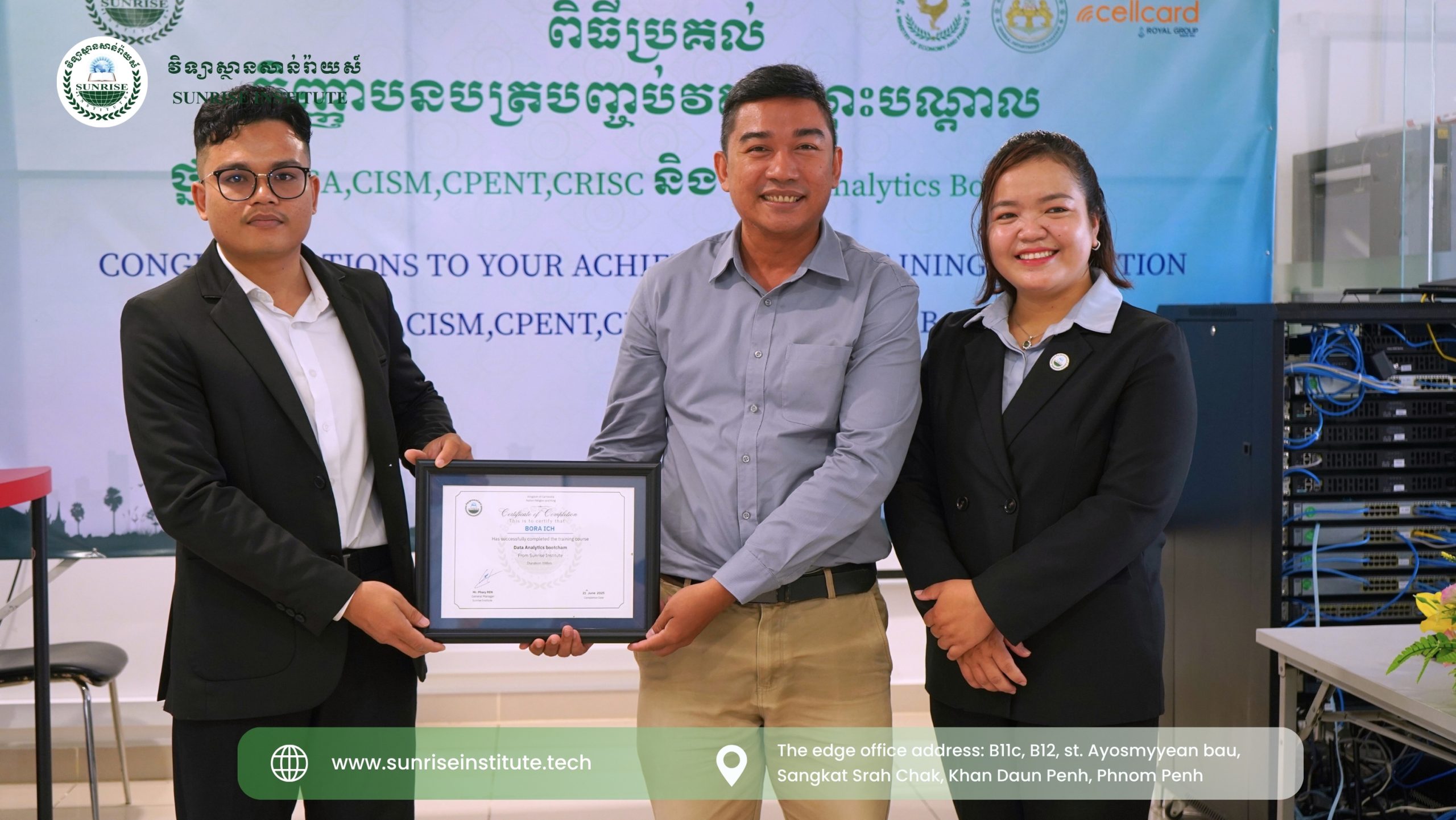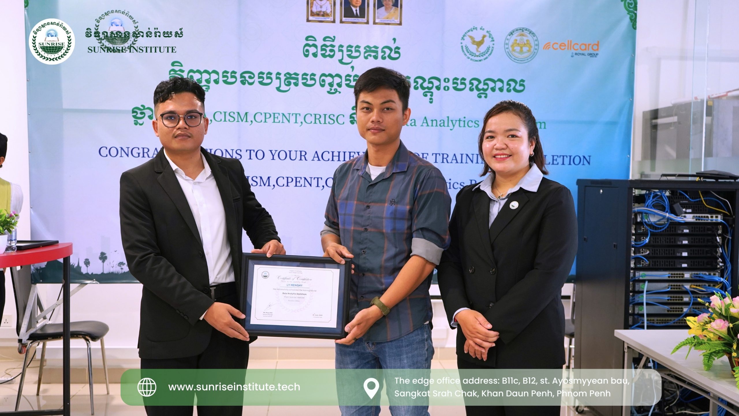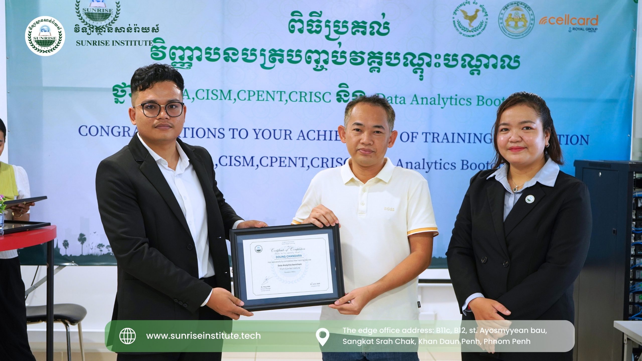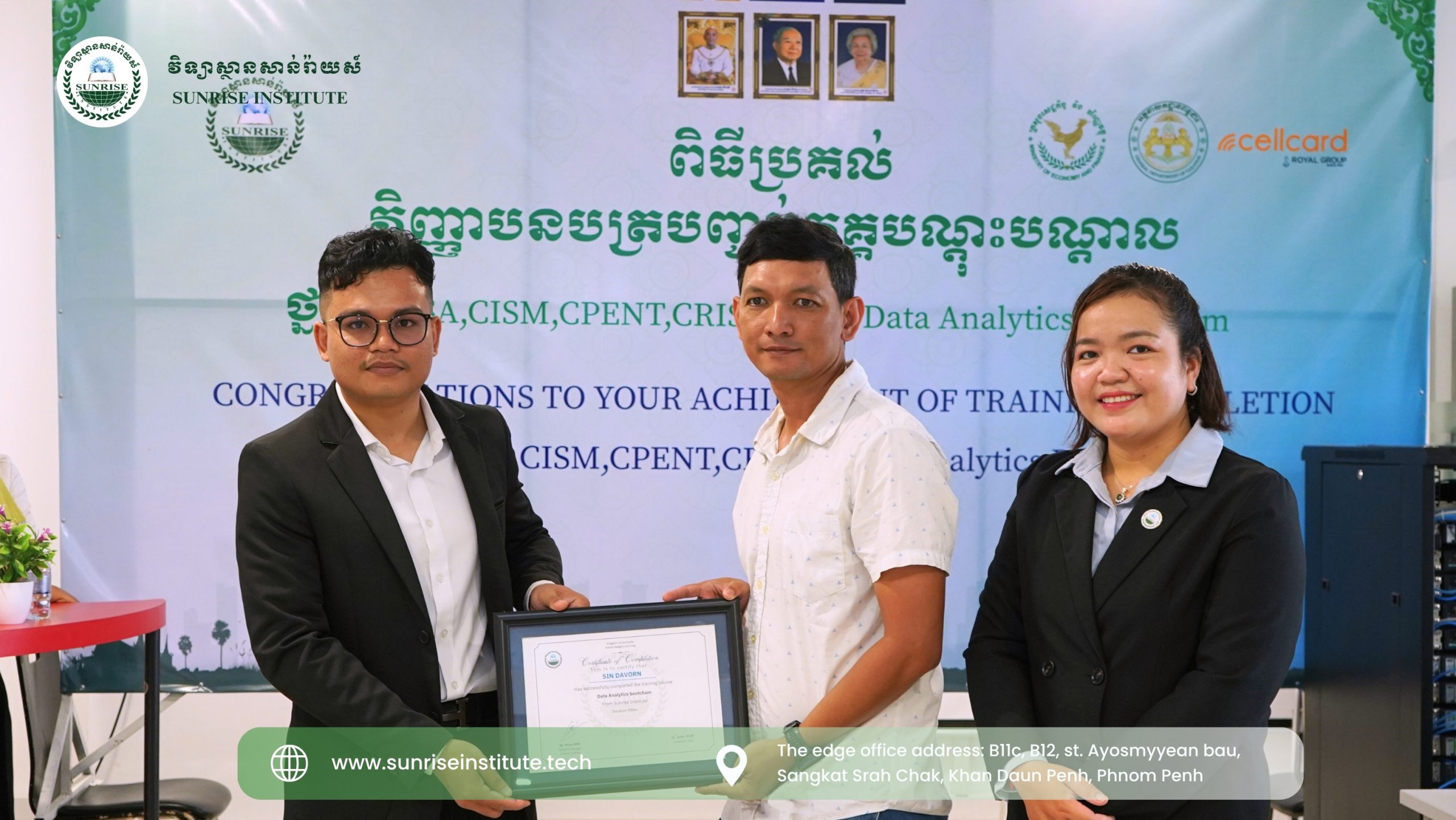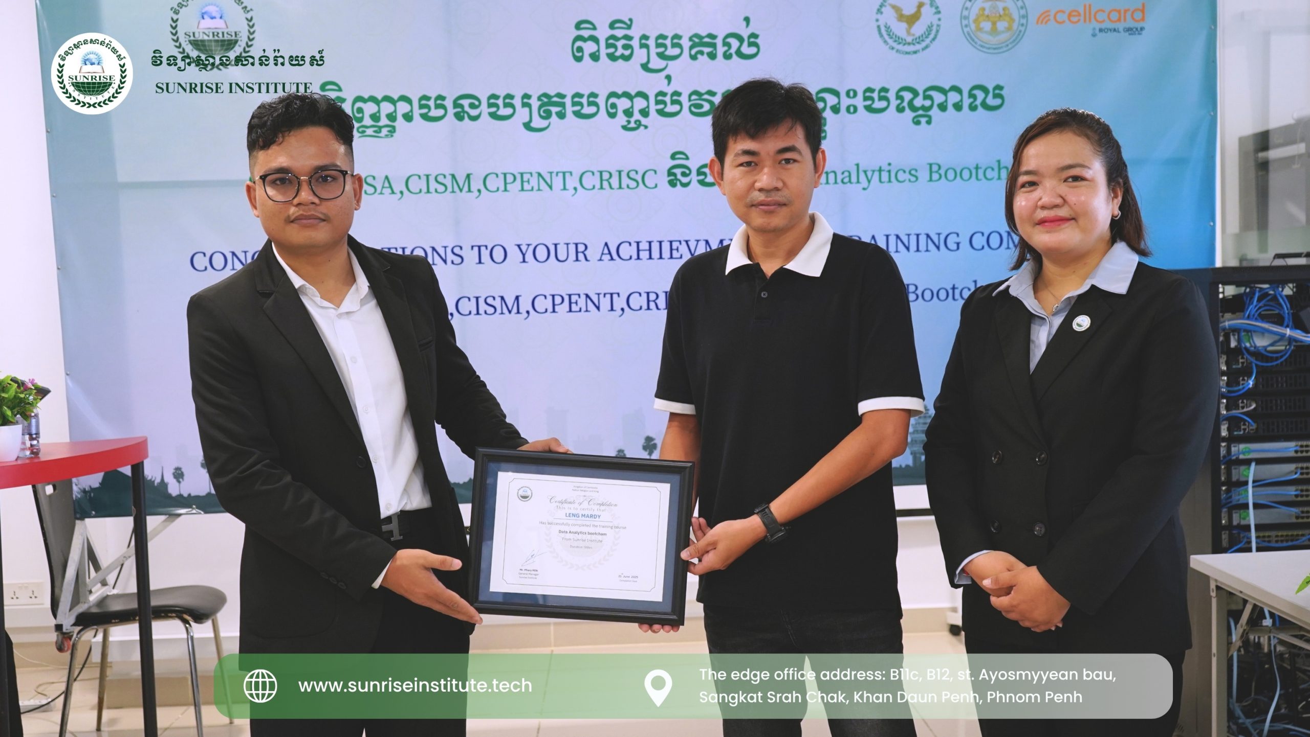 សូមអបអរសាទរដល់សក្ខាកាមដែលមកពីនាយពន្ធដារនឹង ក្រុមហ៊ុន Cellcard ដែលបណ្តុះបណ្តាលលើជំនាញ CISA ,CISM ,CPENT ,CRISC, Data Analytics បញ្ចប់ដោយជោគជ័យ ជំនាន់ទី១៥ នៃវិទ្យាស្ថានសាន់រ៉ាសយ៍។ កម្មវិធីនេះ ប្រព្រឹត្តទៅនៅថ្ងៃសៅរ៍ ៨ កើត ខែស្រាពណ៍ ឆ្នាំម្សាញ់ សប្តស័ក ពុទ្ធសករាជ ២៥៦៩ ត្រូវនឹងថ្ងៃទី២ ខែសីហា ឆ្នាំ២០២៥ ។