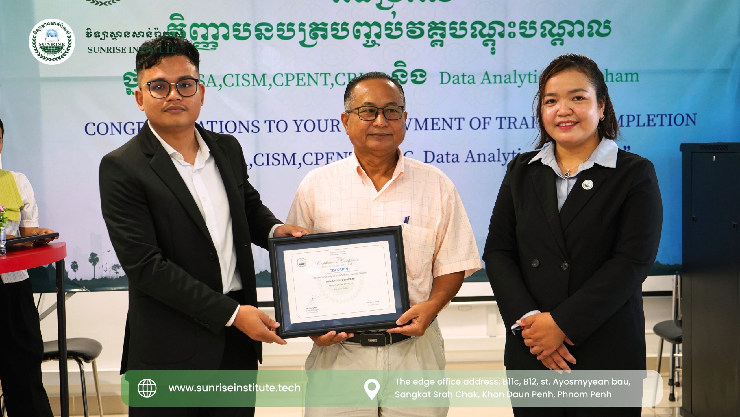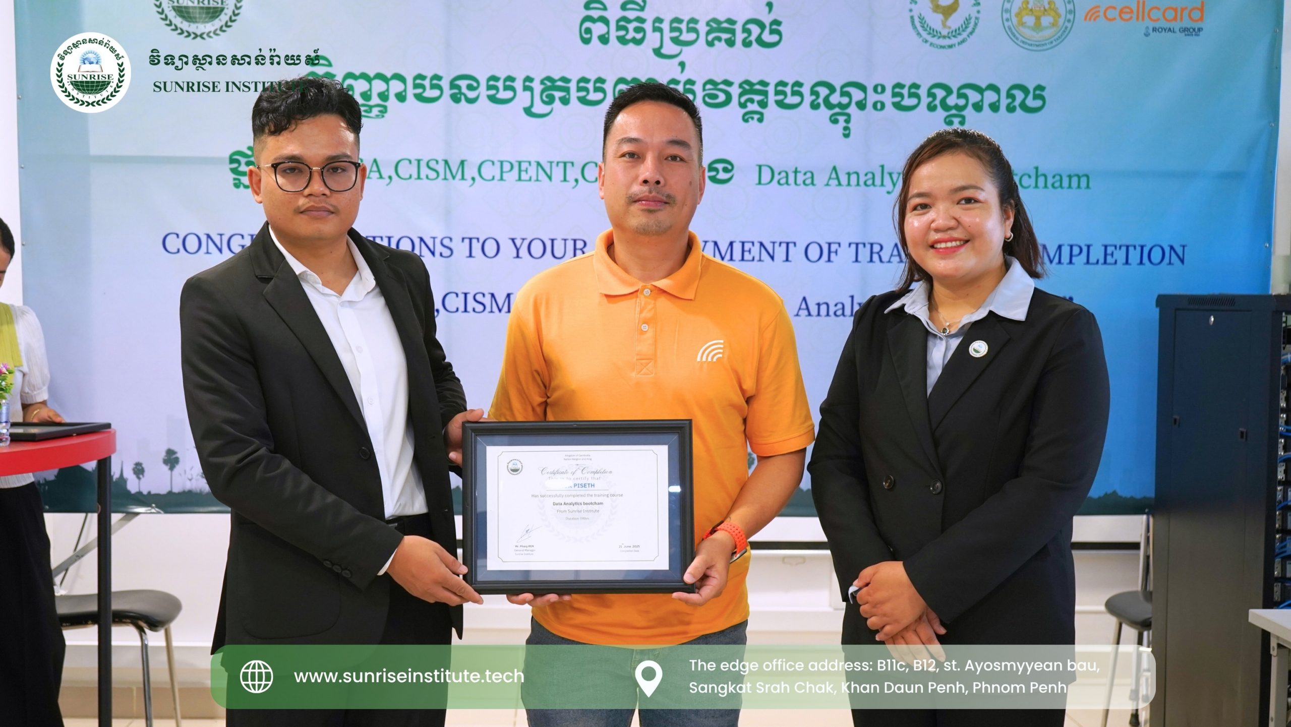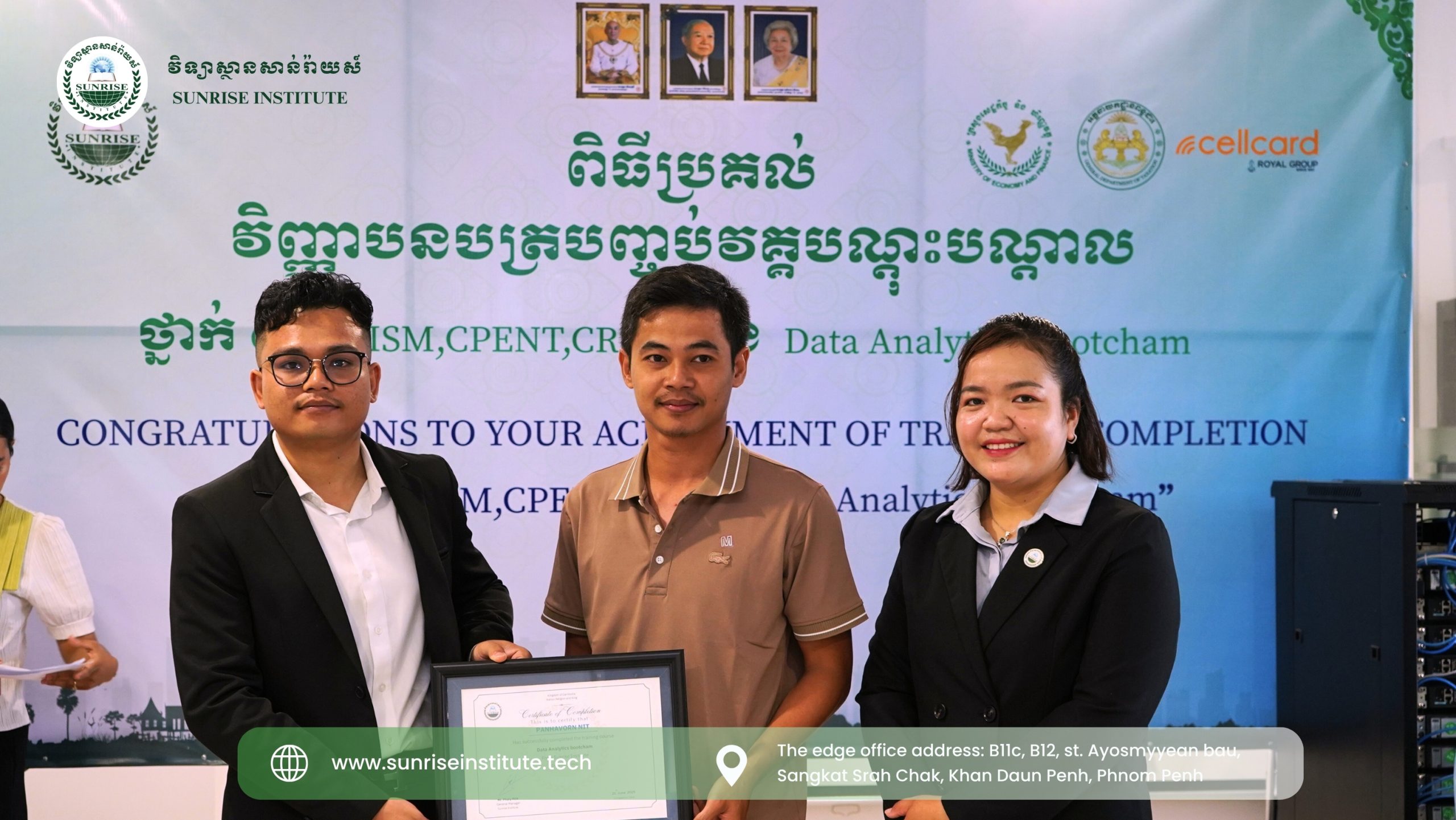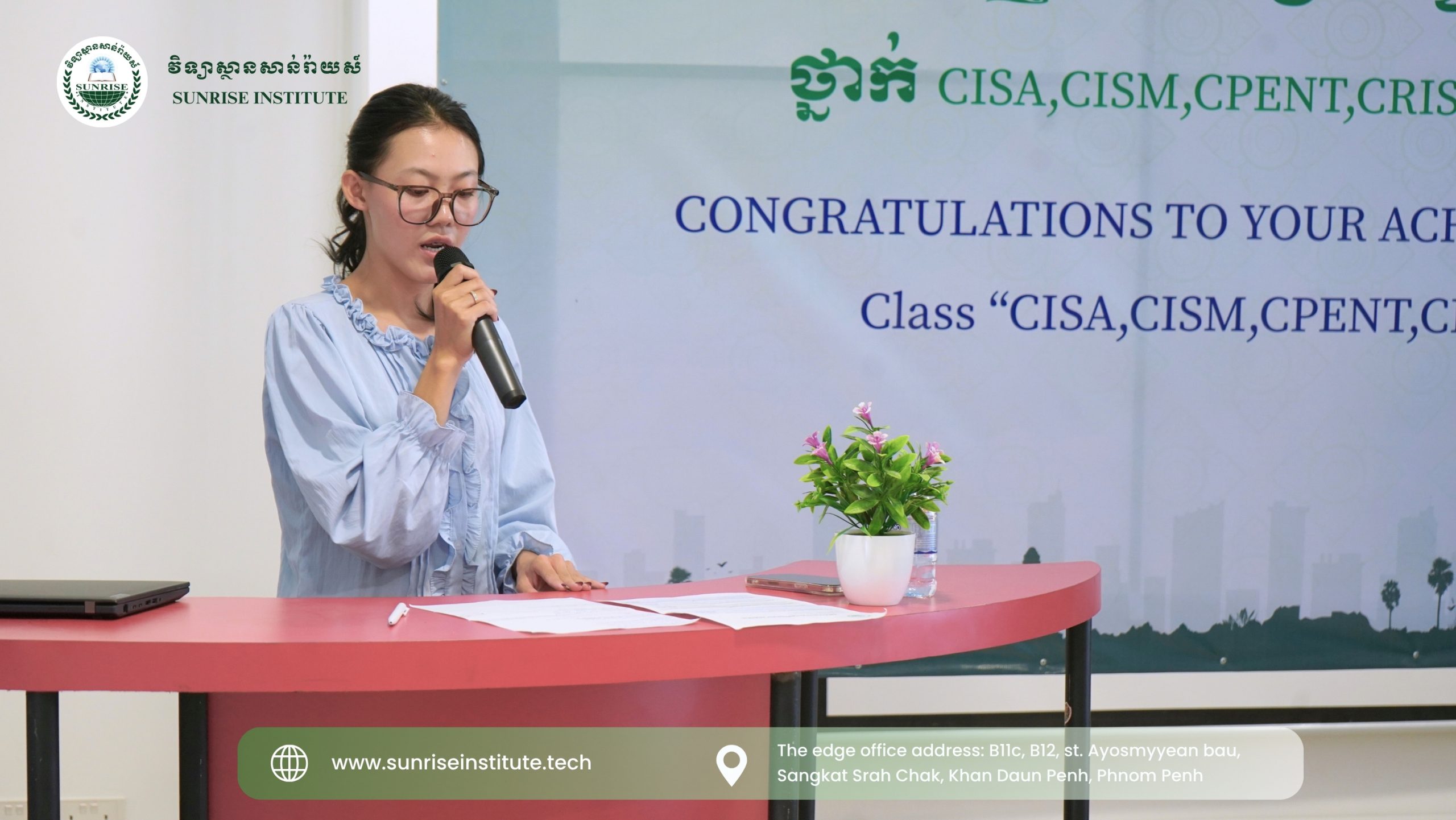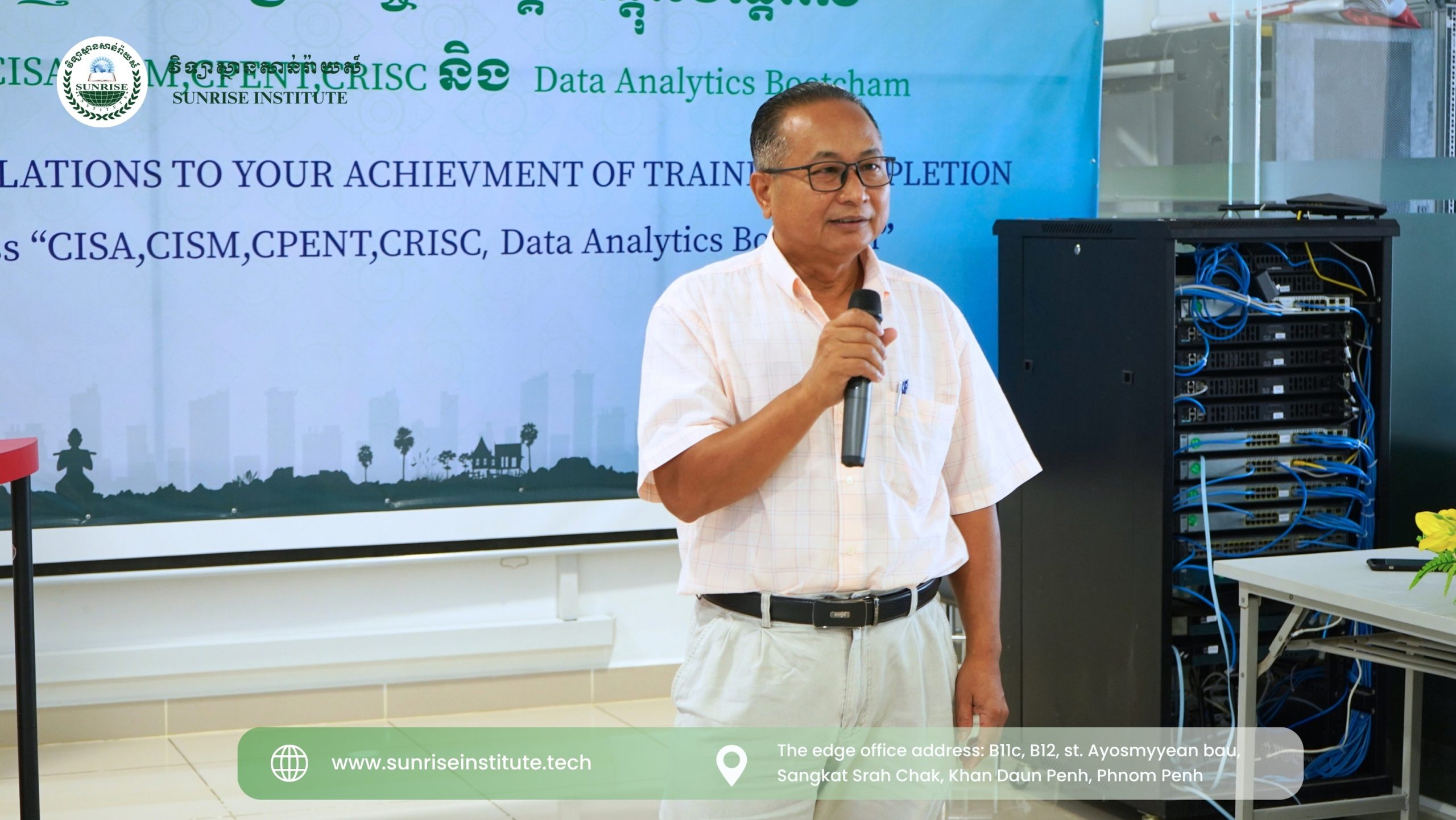 សូមអបអរសាទរដល់សក្ខាកាមដែលមកពីនាយពន្ធដារនឹង ក្រុមហ៊ុន Cellcard ដែលបណ្តុះបណ្តាលលើជំនាញ CISA ,CISM ,CPENT ,CRISC, Data Analytics បញ្ចប់ដោយជោគជ័យ ជំនាន់ទី១៥ នៃវិទ្យាស្ថានសាន់រ៉ាសយ៍។ កម្មវិធីនេះ ប្រព្រឹត្តទៅនៅថ្ងៃសៅរ៍ ៨ កើត ខែស្រាពណ៍ ឆ្នាំម្សាញ់ សប្តស័ក ពុទ្ធសករាជ ២៥៦៩ ត្រូវនឹងថ្ងៃទី២ ខែសីហា ឆ្នាំ២០២៥ ។